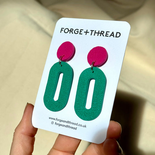 FUCHSIA & GREEN TEXTURED OVAL DROP EARRINGS