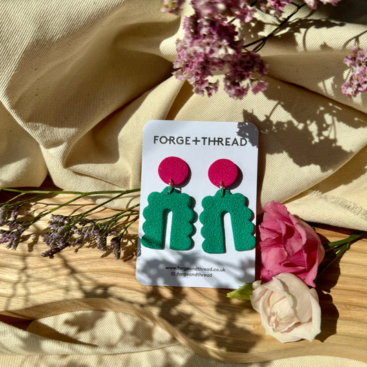 GREEN & PINK TEXTURED SCALLOPED ARCH EARRINGS