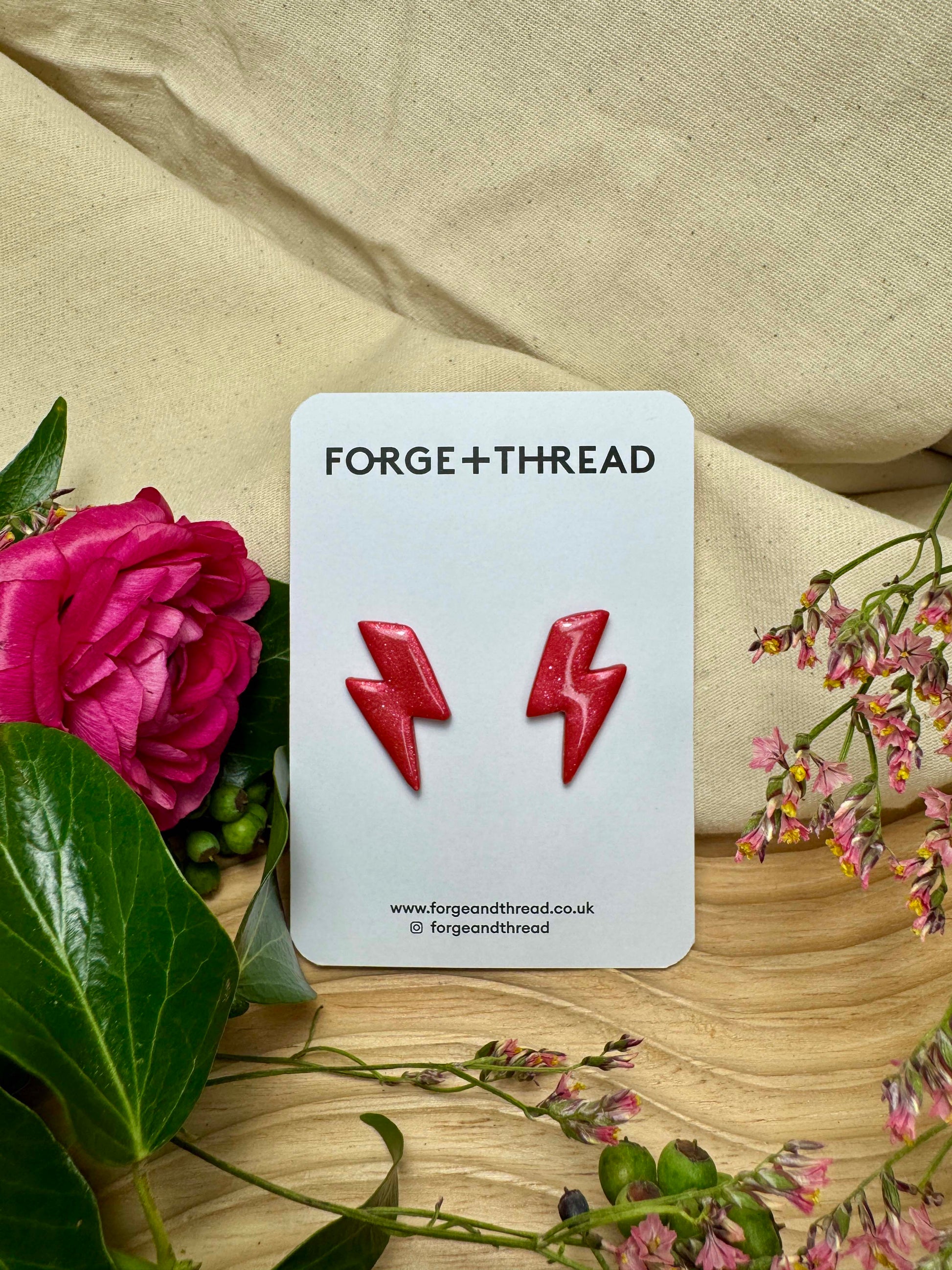 Red metallic lightning studs made from polymer clay with surgical steel posts