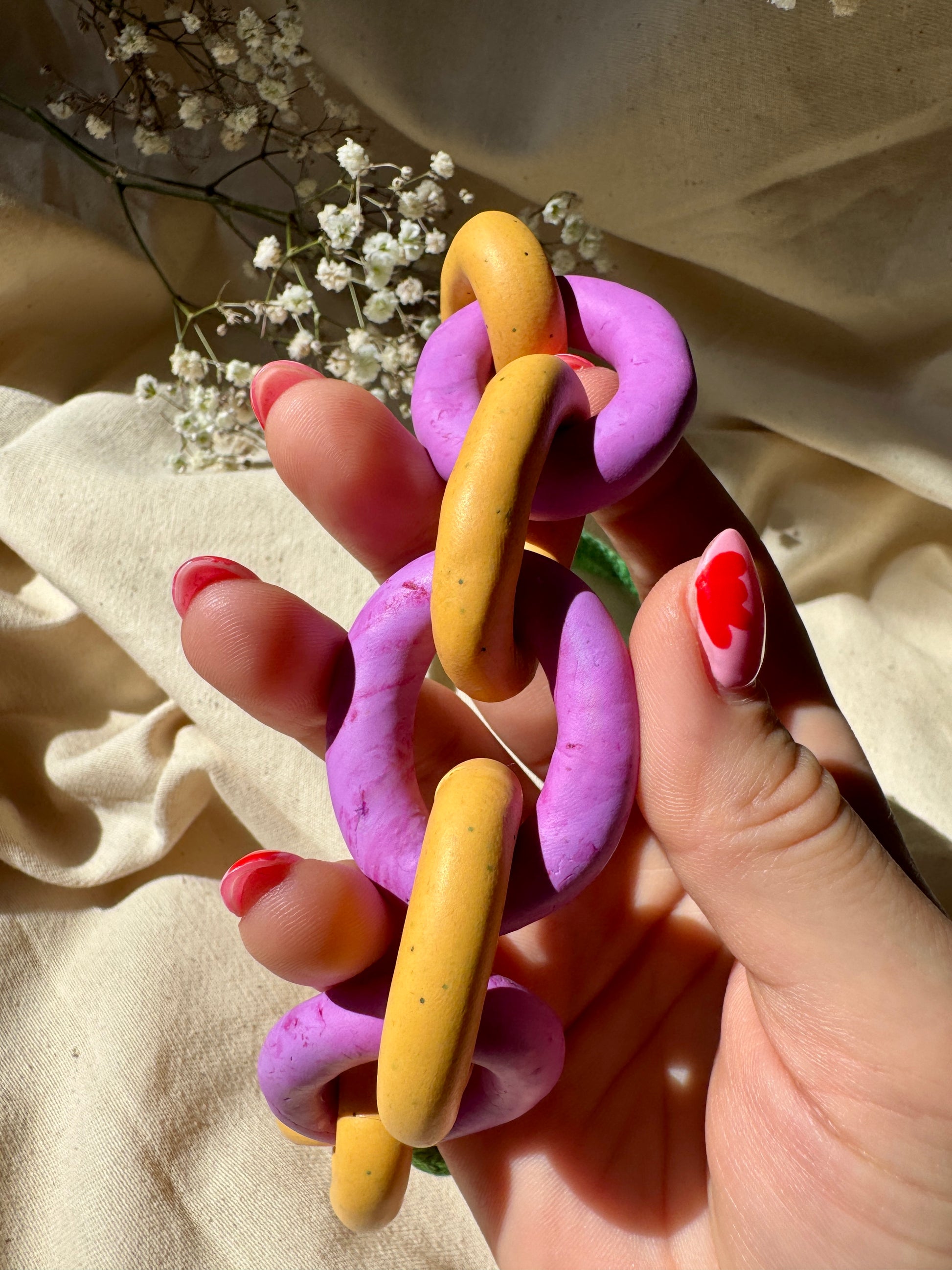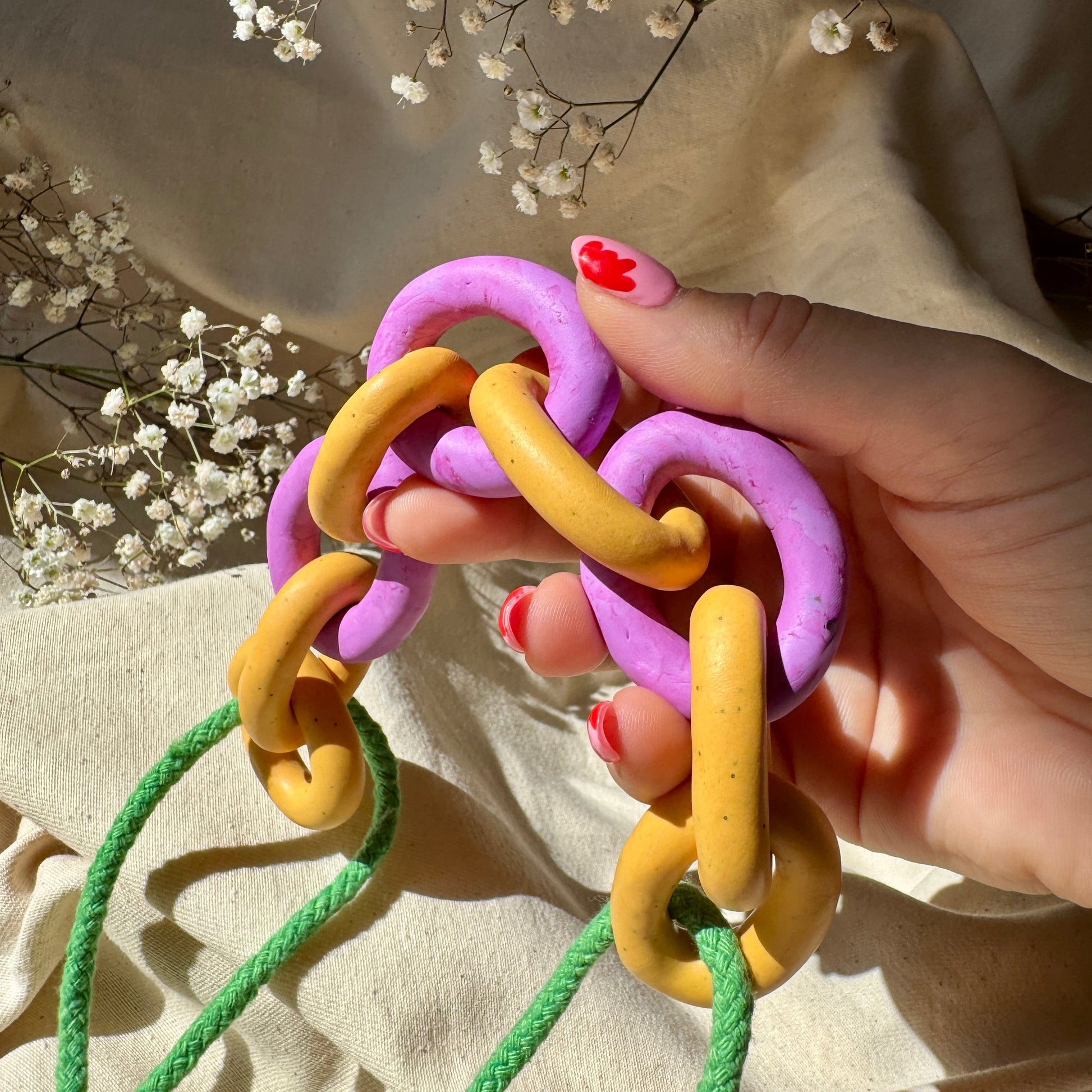 Consisting of 6 ochre yellow speckle hand rolled and formed links and 3 chunky purple marble links for a pop of colour, set against green cotton cord
